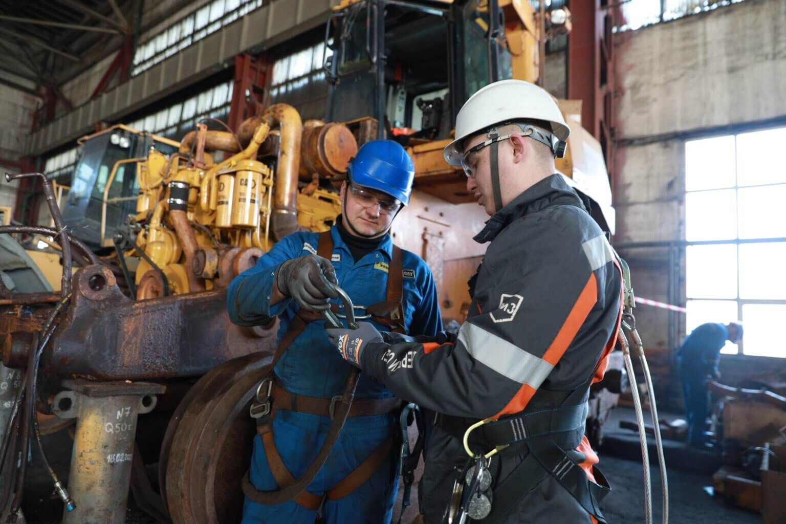 Владислав Галайда механік підрядної організації «Цеппелін Україна», яка постачає потужну техніку Caterpillar, бере участь у її технічному обслуговуванні та ремонтах, зараз обслуговує доволі габаритний бульдозер. Під час виконання деяких операцій він користується запобіжним поясом, що захищає від падінь.