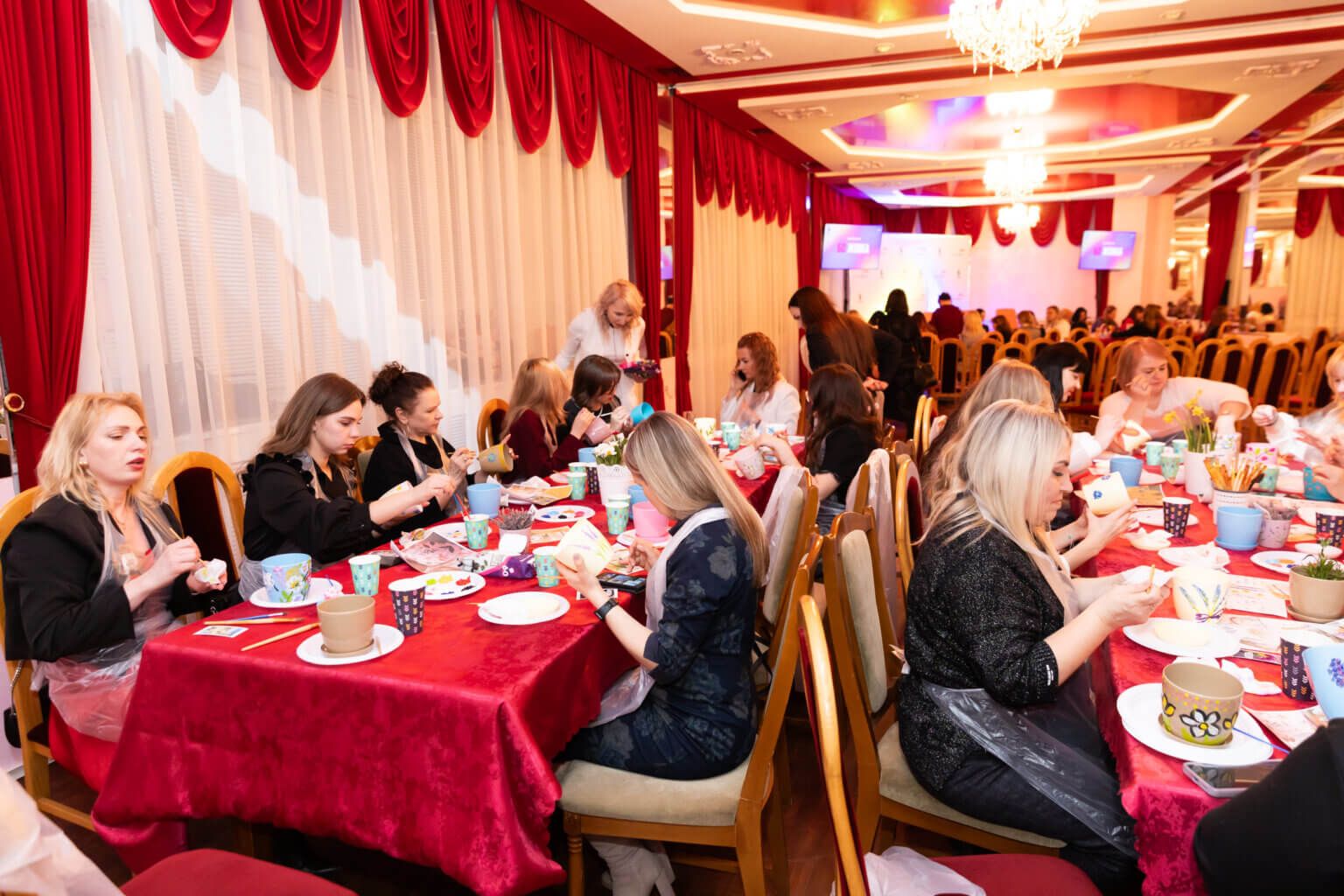 Цього разу на учасниць чекали одразу аж три творчих завдання: розпис акриловими фарбами старих платівок, квіткових горщиків та ліпка на дзеркалах.